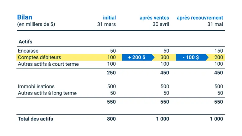 Au cours du mois de mai, votre entreprise recouvre 100 000 $ au titre des comptes débiteurs. Encore une fois, pour simplifier les choses, supposons qu’il s’agit de la seule transaction du mois. Vous comptabilisez alors une diminution des comptes débiteurs, de 300 000 $ à 200 000 $. Le bilan après recouvrement reflète l’incidence du recouvrement sur les comptes débiteurs.