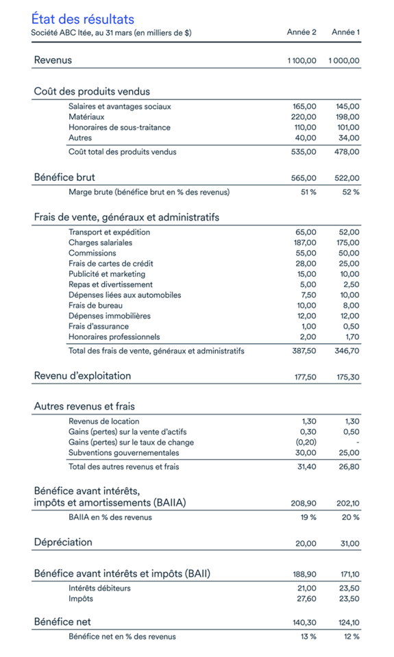 Dans l’état des résultats ci-dessous, le CPV de la Société ABC ltée était de 535 000 $ en 2022 et de 478 000 $ en 2021.