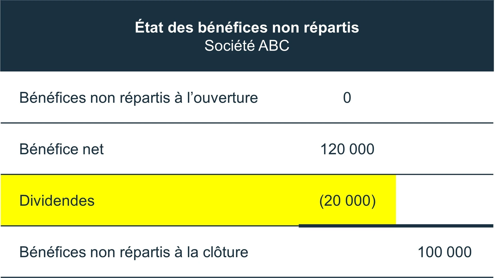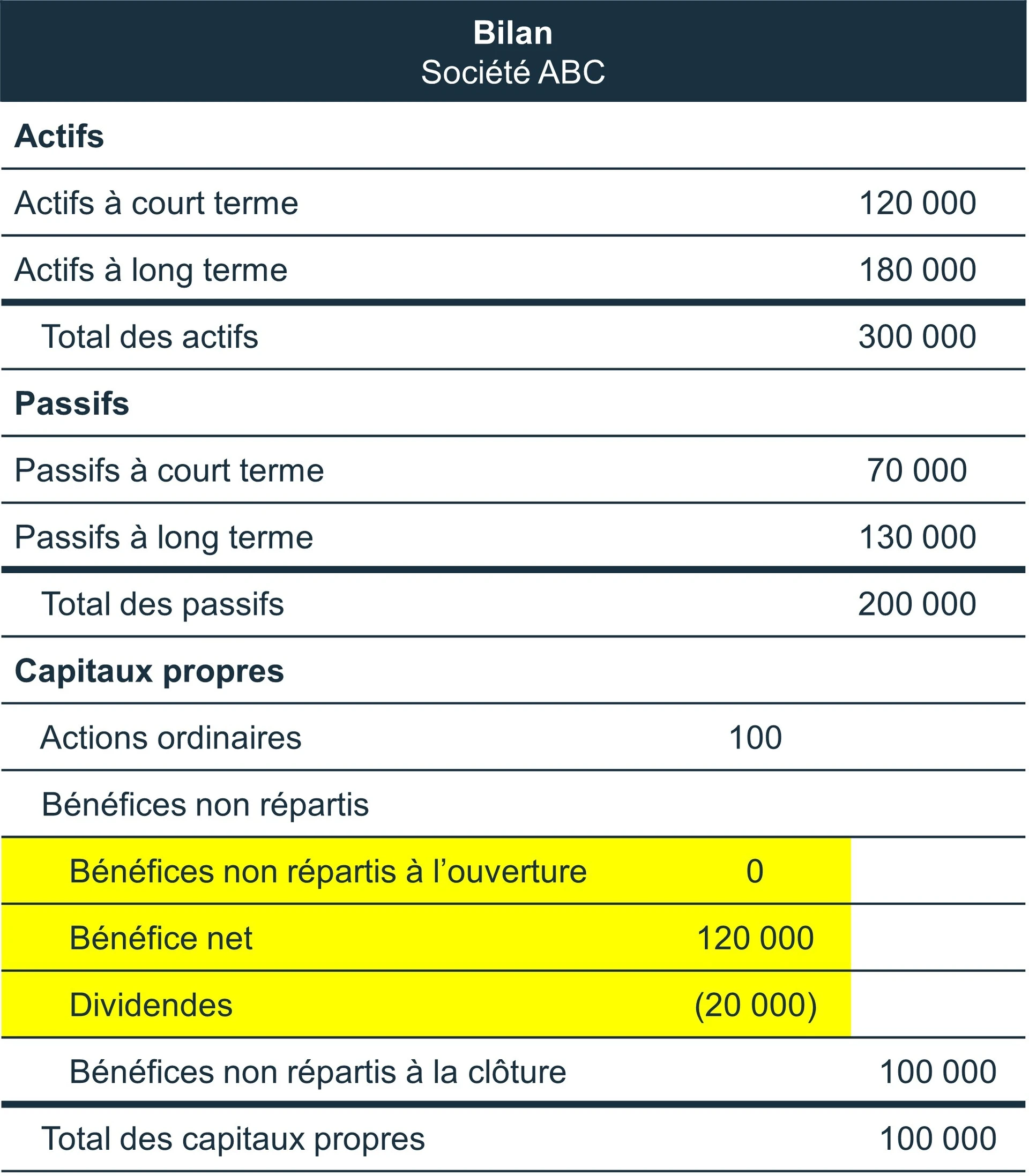 Bénéfice non réparti (100 000$) = Bénéfices non répartis à l’ouverture (0$) + Bénéfice net (120 000$) – dividendes (20 000$)