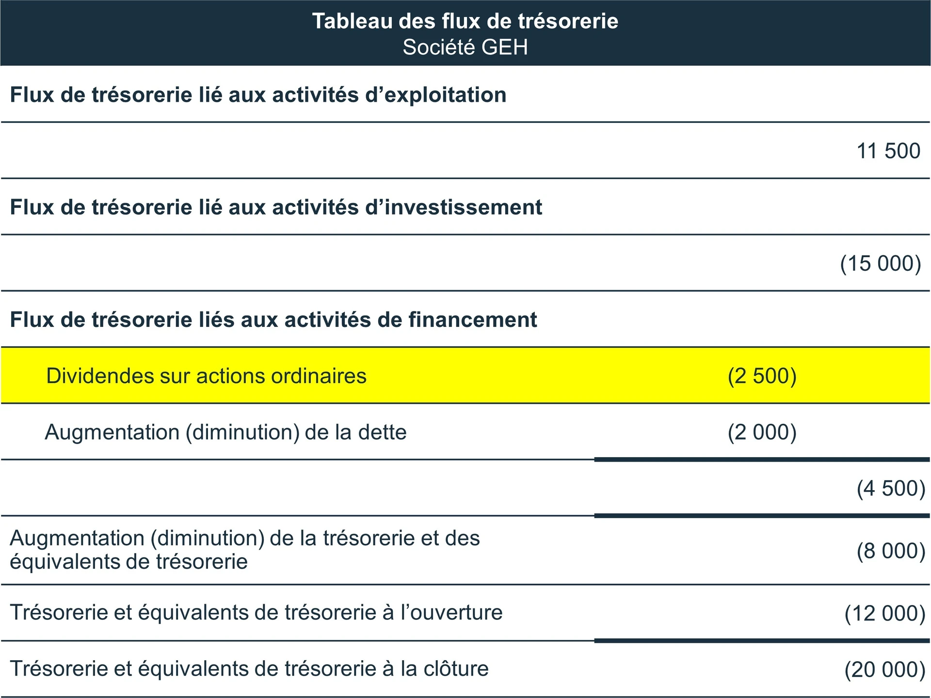 Cet état des flux de trésorerie présente ici les dividendes dans la section des flux de trésorerie liés aux activités de financement. Si l’entreprise avait utilisé une autre norme comptable, elle les aurait placés dans la première section, les flux de trésorerie liés aux activités d’exploitation.