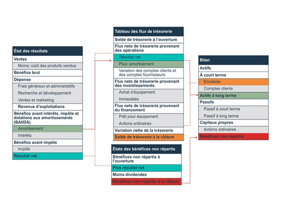 Les quatre états financiers sont liés. Par exemple, le bénéfice net est comptabilisé au bas de l’état des résultats (voir ci-dessous). On le retrouve également dans l’état des flux de trésorerie et dans l’état des bénéfices non répartis. Une fois les dividendes soustraits, on obtient les bénéfices non répartis, qui sont inscrits au bilan.