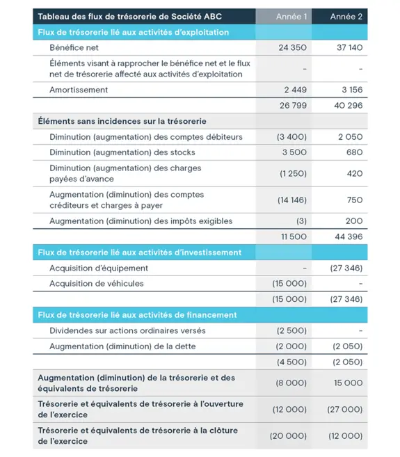 L’état des flux de trésorerie, parfois appelé état de l’évolution de la situation financière, indique comment votre trésorerie,incluant les équivalents de trésorerie, a évolué au sein de votre entreprise au cours de l’exercice. Les équivalents de trésorerie sont constitués des placements à court terme très liquides et facilement convertibles en trésorerie. Ils sont généralement détenus pour une période inférieure à trois mois.