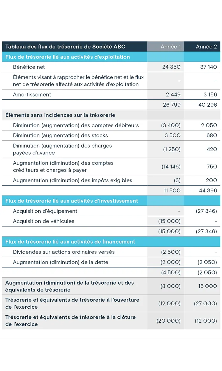Bien que les flux de trésorerie disponibles ne figurent pas comme un poste dans les états financiers, les chiffres nécessaires pour effectuer le calcul se trouvent dans l’état de l'évolution de la situation financière (parfois appelé «état des flux de trésorerie») et l’état des résultats d’une entreprise. À l’aide de l’exemple de la société ABC ci-dessous, les flux de trésorerie disponibles sont calculés comme suit la première année: