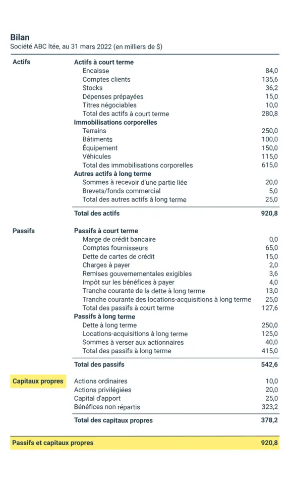On trouve les fonds propres au bas du bilan dans la section sur les capitaux propres,