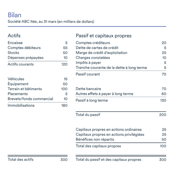 L’extrait ci-dessous montre où la marge de crédit d’exploitation figure dans le bilan d’une entreprise avec divers autres éléments du passif courant. Les modalités de paiement sont propres à chaque type de prêt ou de crédit.