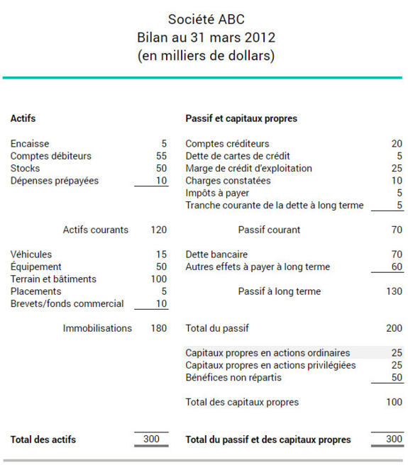 Les actions ordinaires et privilégiées figurent à titre de capitaux propres au bilan, comme le montre l’exemple ci-dessous: