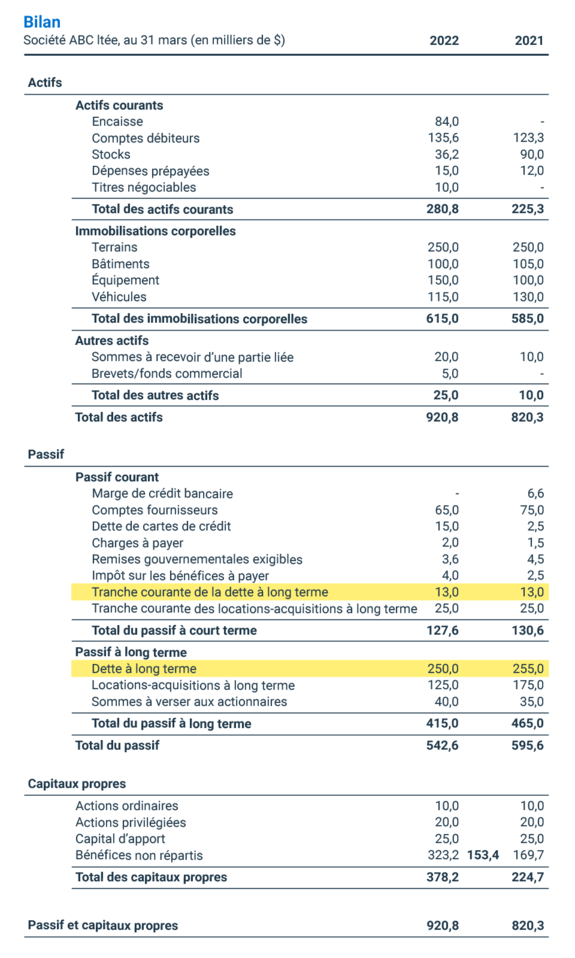 Dans l’exemple de bilan ci-dessous, les lignes pour la dette à long terme et la tranche courante de la dette à long terme sont surlignées en jaune.