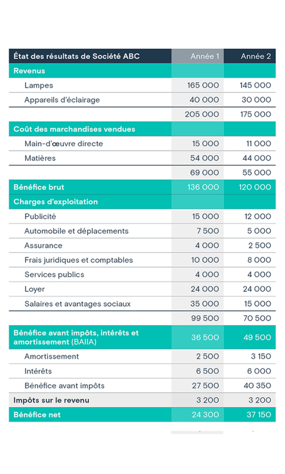 L’état des résultats présente la rentabilité de votre entreprise. Il indique ce que votre entreprise a gagné et ce qu’elle a dépensé. L’état des résultats est parfois aussi appelé compte de profits et pertes ou compte de résultats.