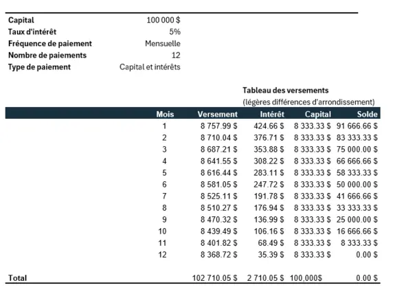 Voici un exemple pour un prêt de 100 000 $ avec une période d’amortissement de 12 mois, un taux d’intérêt fixe de 5 % et des paiements mensuels égaux de capital constant avec un paiement total décroissant. Le paiement du capital reste le même chaque mois, alors que les paiements d’intérêts et les paiements mensuels totaux baissent.