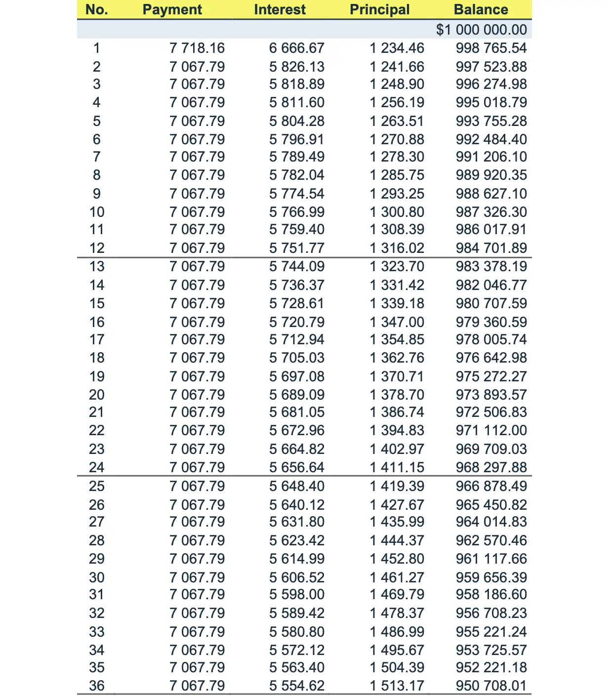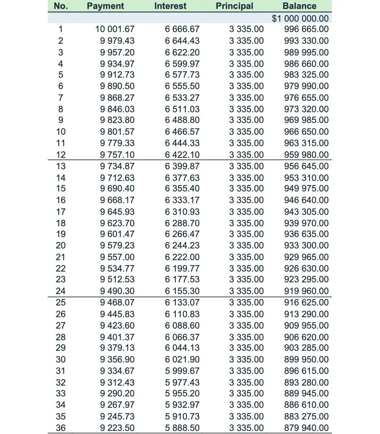 Par exemple, dans le cas d’un prêt de 100 000 $ avec une période d’amortissement de 10 ans, nous divisons 100 000 $ par 120 (le nombre de mois) pour obtenir des versements mensuels de capital de 833,33 $.