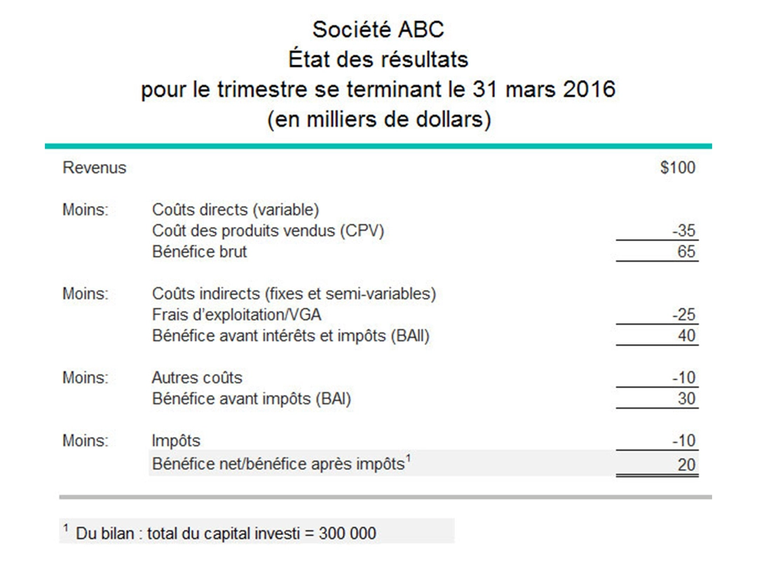 Le bénéfice net apparaît sur l’état des résultats de l’entreprise. Le capital total investi apparaît sur le bilan.
