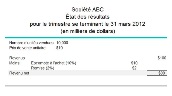 Quand une entreprise offre un escompte ou une remise à une cliente ou un client, cela apparaît sur l’état des résultats en tant que réduction de revenus. Cela signifie que le chiffre du revenu net est le chiffre d’affaires «réel» pour la période donnée.