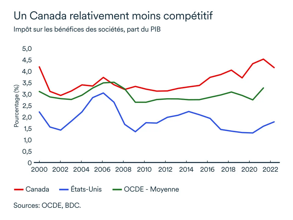 Si les États-Unis réduisent considérablement l'impôt sur les sociétés, le Canada pourrait perdre son avantage concurrentiel pour attirer les entreprises et les investissements. Des taux d'imposition moins élevés les encourageraient probablement à investir plutôt aux États-Unis. La réduction d'impôt devrait stimuler la valeur des actions et avoir un effet d'entraînement sur d'autres marchés financiers (y compris le marché canadien) en augmentant la richesse des investisseurs canadiens.