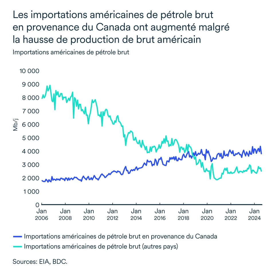 Au cours de son premier mandat à la présidence, Donald Trump n'a pas imposé de droits de douane sur le commerce de l'énergie, contrairement à d'autres biens intermédiaires (par exemple les intrants) comme les importations d'acier et d'aluminium canadiens. Autre signe que sa toute nouvelle administration pourrait être plus encline au secteur énergétique canadien, il a également soutenu l'expansion de l'oléoduc Keystone XL, qui aurait permis d'acheminer davantage de brut de l'Ouest canadien vers les États-Unis.