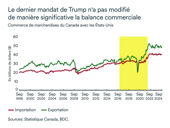 Un gouvernement Trump prévoit imposer un droit de douane universel de base de 10 % sur toutes les importations américaines et un droit de douane de 60 % sur les importations en provenance de la Chine. Ces droits de douane perturberaient le commerce mondial, et pas seulement les exportations canadiennes. Les tarifs imposés au Canada pourraient faire l’objet de négociations et des exceptions pourraient être accordées en raison de l'étroite intégration de la chaîne d'approvisionnement entre les deux pays. Quoi qu'il en soit, le ralentissement de la croissance économique mondiale et l'augmentation du prix des importations canadiennes réduiraient la demande internationale de produits canadiens. Les exportateurs en ressentiraient évidemment les effets.