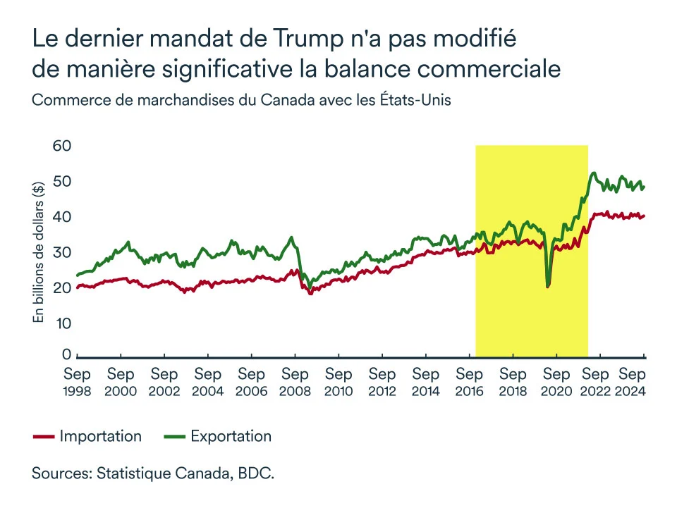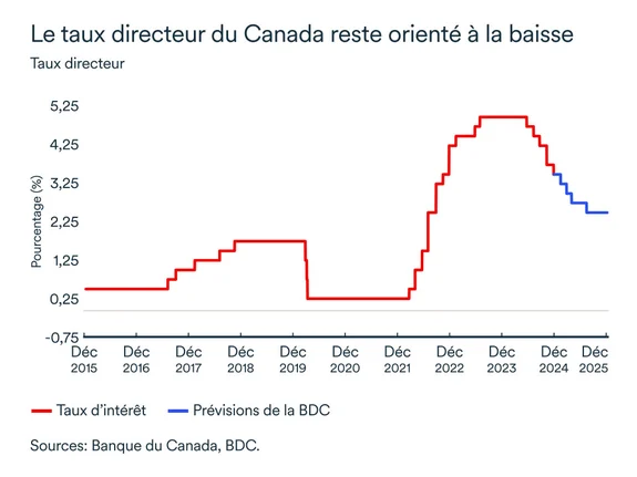 - L'imposition de droits de douane sur toutes les importations américaines, et plus particulièrement sur les importations chinoises, pourrait perturber le commerce mondial, réduire la demande de produits canadiens et accroître la pression sur les prix aux États-Unis, ce qui limiterait la capacité de la Fed à réduire les taux d'intérêt.