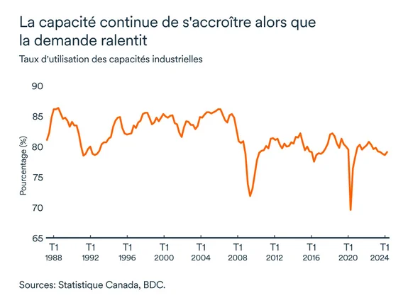 Compte tenu de la diminution de la demande, causée par les taux d’intérêt élevés depuis ces deux dernières années, le taux d’utilisation de la capacité des entreprises du secteur industriel (des biens) se maintient encore à un niveau (79,1 %) parmi les plus faibles, hors crise économique, depuis que Statistique Canada compile cette donnée.
