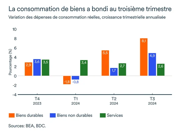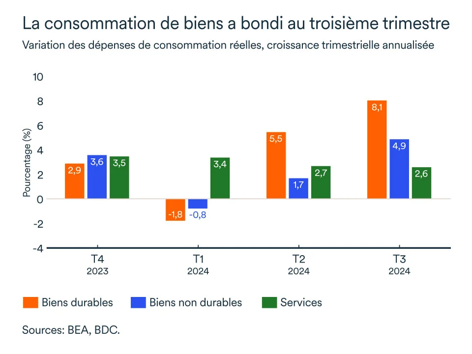 Les consommateurs américains ne se sont pas ménagés au troisième trimestre. Au cours de l’été, les dépenses de consommation se sont accélérées au rythme de 3,7 %. La consommation de bien aura même pris une ampleur considérable (+6.0 %) par rapport au trimestre précédent, alors que l’amélioration s’est aussi poursuivie du côté des services (+2,6 %).