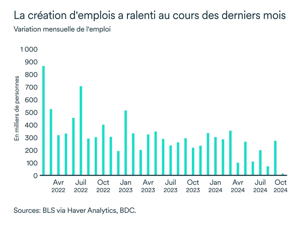Après une première coupe de 50 points en septembre, la Réserve fédérale s’en est tenue à une baisse plus standard lors de l’annonce de novembre en réduisant le taux de 25 points. La sous-performance du marché du travail semble effectivement soutenir des baisses de taux en sol américain, mais l’inflation pose encore un certain risque avant que l’économie n’atteigne une croissance stable et soutenable.