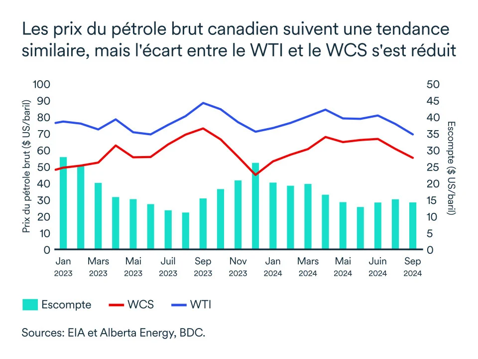 L’écart entre le Western Canadian Select (WCS) et le West Texas Intermeidate (WTI) était d’environ 12$ US en octobre 2024, une amélioration considérable par rapport à la même période l’an dernier alors qu’il était plus près des 25$ US.