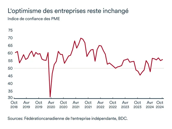 L'optimisme des entreprises canadiennes n'a pas beaucoup changé depuis mai 2024. Selon l'indice de confiance des entreprises de la FCEI pour l'année à venir, l'optimisme des entreprises est resté stable en octobre à 55,8. Cela fait maintenant six mois consécutifs que l'indice se maintient au-dessus du seuil fatidique des 50, sans enregistrer de gains ni de pertes majeures. L’indice semble donc confirmer que les entreprises restent sur le qui-vive et se montrent patientes en attendant une reprise de la demande et une baisse des taux d'intérêt.