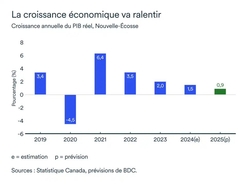 Par ailleurs, le ralentissement de la croissance démographique et l'absence de grands projets d'investissement limiteront les perspectives de croissance cette année. Néanmoins, la province devrait être en tête des provinces atlantiques alors que le PIB réel devrait augmenter de 1,5 % en 2025.