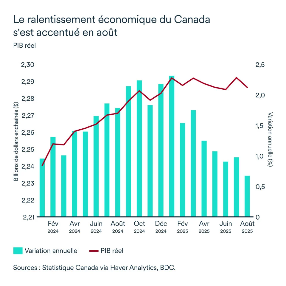 Au cours des huit premiers mois de l’année, l’économie canadienne a progressé de 1,3 % par rapport à la même période en 2024. Considérant que des vents de face soufflent encore sur l’économie du pays, le risque que la croissance ralentisse encore davantage au dernier trimestre de l’année demeure, mais des signes avant-coureurs pointent davantage vers une économie résiliente.