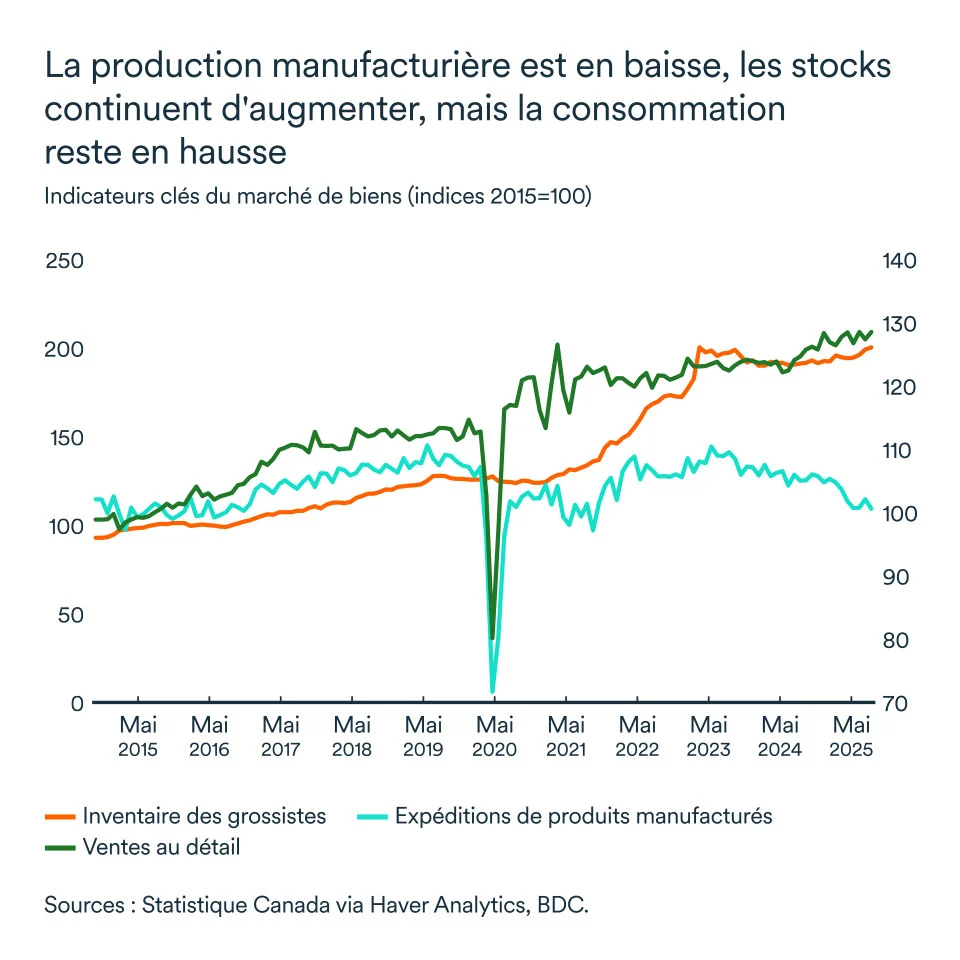 Une dynamique mixte apparaît donc dans l’économie canadienne. D’une part, la production manufacturière est toujours en recul sous les tensions commerciales et les stocks en hausse. Par ailleurs, la consommation demeure en hausse par rapport à l’an dernier, encore soutenue par l’emploi.