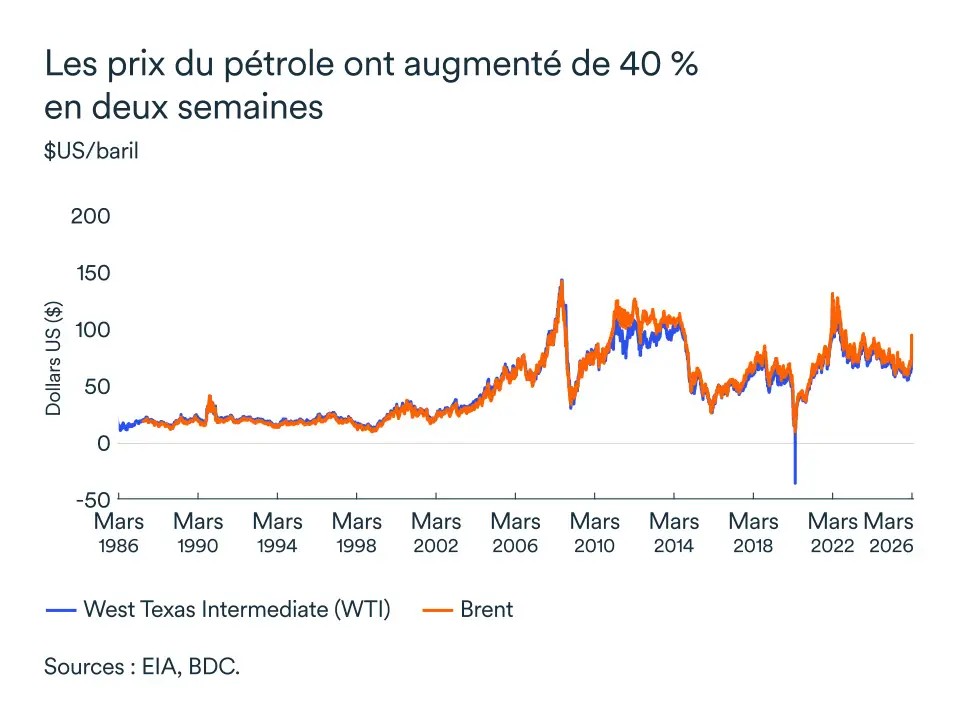 Le prix du pétrole brut a bondi de 40 % depuis le début du conflit au Moyen-Orient, passant de 65 $US le baril à la fin de février à près de 95 $US le baril de brut américain ces jours-ci. En réaction aux premières frappes israélo-américaines du 28 février, l’Iran a bloqué le détroit d’Ormuz – une voie maritime du Moyen-Orient cruciale pour le transit du pétrole. L’onde de choc s’est fait rapidement ressentir dans le marché énergétique, alors que le baril aura même dépassé la barre des 100 $US.