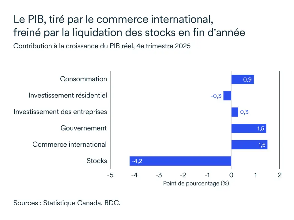 Au dernier trimestre, l’économie a toutefois enregistré un recul de 0,6 % (rythme annualisé). Les fondamentaux de l’économie canadienne ont pourtant connu une solide performance. Les dépenses de consommation et l’investissement des entreprises (hors résidentiel) ont en effet contribué positivement à la croissance du PIB. Le commerce international a aussi joué un rôle d’envergure et, somme toute, positif au cours du trimestre. Les exportations de biens et services canadiens ont augmenté de 1,8 %, tandis que les importations ont ralenti davantage. Au net, le commerce extérieur a aussi soutenu la croissance.