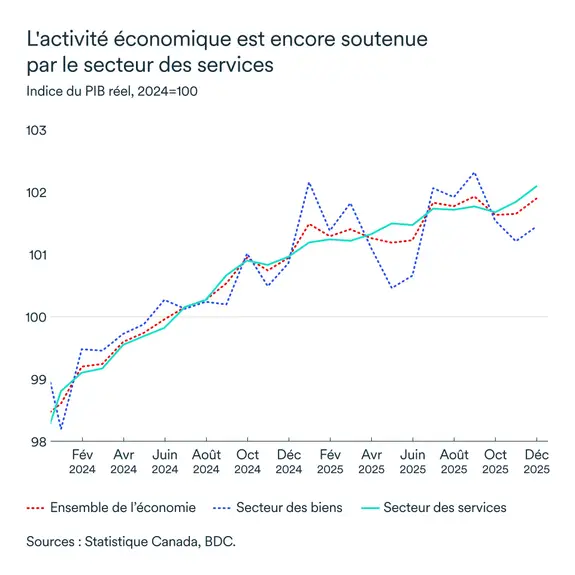 En décembre 2025, toutefois, le PIB autant du secteur des services que des biens a connu une hausse de 0,2 % par rapport à novembre.