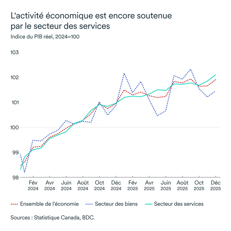 Une bonne partie de cette résilience économique s’explique par l’importance de notre secteur des services. Alors que le contexte actuel de tarifs douaniers continue de susciter l’incertitude et de la volatilité dans le secteur des biens, dont la fabrication, les industries des services sont plus sensibles aux conditions économiques intérieures.