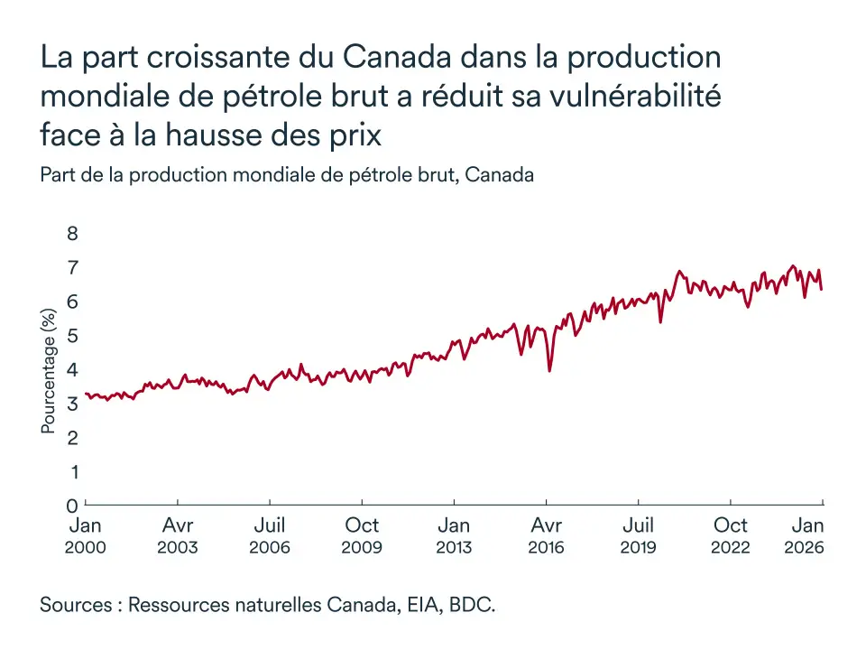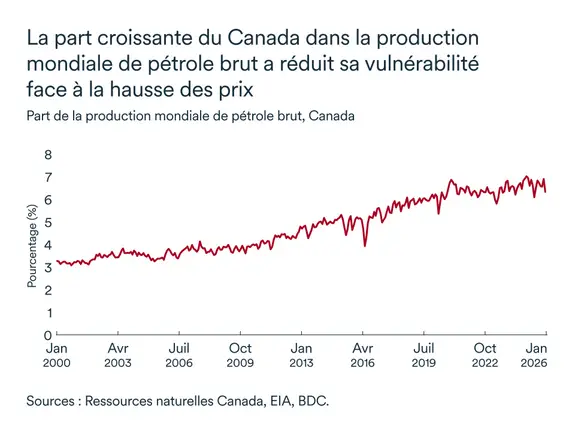 Pour les entrepreneurs canadiens, la hausse du prix du brut est un nouveau vent de face à affronter en 2026. Les coûts de production étaient déjà un enjeu pour plusieurs entreprises canadiennes et la situation s’accentuera, si les prix du brut demeurent élevés, car l’onde de choc sur les prix à travers la chaîne de production s’échelonnera sur une plus longue période. La hausse des prix à la pompe vient aussi directement réduire le pouvoir d’achat des ménages, ce qui pourrait ralentir davantage la demande pour vos biens et services, même hors énergie. Les marges seront encore plus compressées pour les producteurs des secteurs non énergétiques.