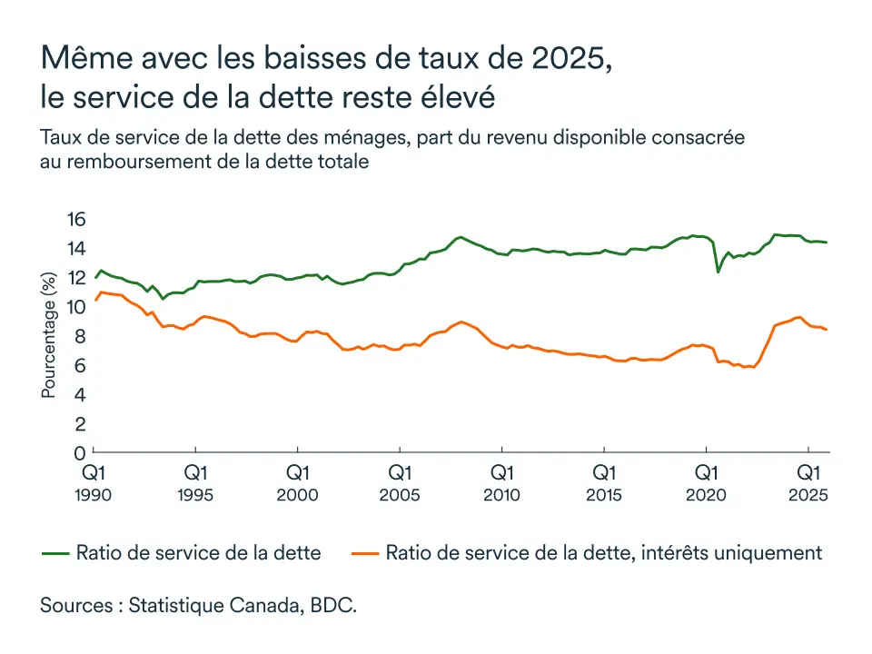 Malgré des baisses additionnelles du taux directeur par la Banque du Canada en 2025, le service de la dette, c’est-à-dire la part du revenu disponible des ménages dédiée exclusivement à son remboursement, reste élevé.
