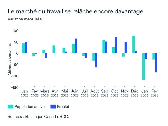 L'emploi s'est légèrement affaibli en février, faisant grimper le taux de chômage à 7,2 %. Toutefois, le niveau d'emploi est resté supérieur à la moyenne de 2025 et les pertes enregistrées en février ont été bien moins importantes qu'au niveau national.