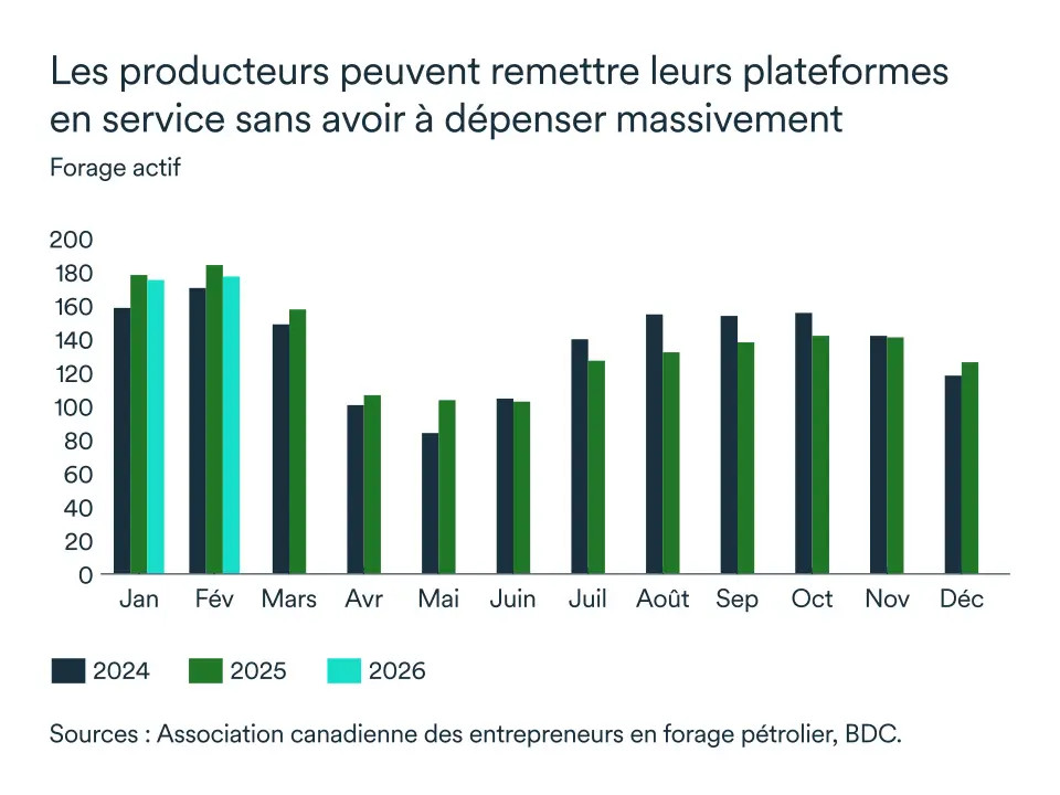 Les activités de forage ont légèrement baissées au cours des deux premiers mois de 2026, par rapport à 2025, ce qui témoigne d'investissements et d'opérations sur le terrain modestes, mais soutenus. Alors que les tensions au Moyen-Orient s’intensifiaient, les producteurs de l'Alberta sont bien placés pour augmenter leur production sans avoir à engager de dépenses massives afin de tirer parti de la récente hausse des prix.