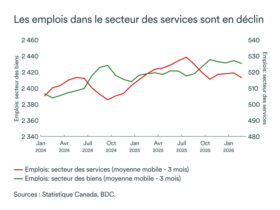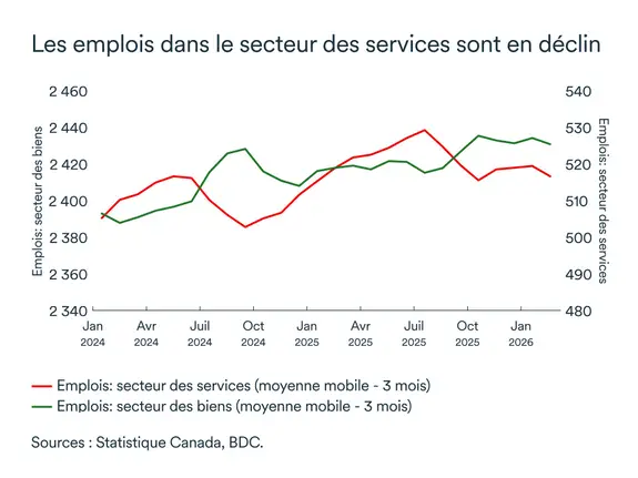 Le marché de l’emploi a perdu environ 20 000 postes en février. Si les secteurs des biens et des services ont tous deux enregistré des baisses d'ampleur similaire, le niveau d'emploi dans les industries productrices de biens s'est maintenu au-dessus de la moyenne de 2025, tandis que les industries de services ont vu l'emploi reculer sous leur pic estival.