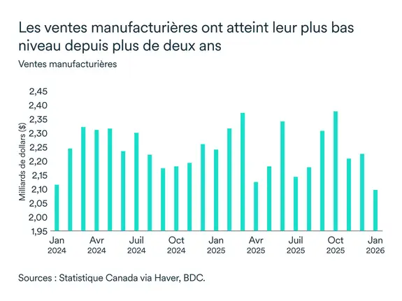 Du côté de l'industrie, les expéditions manufacturières continuent de ralentir, atteignant leur plus bas niveau en plus de deux ans. Les ventes manufacturières ont baissé de 8 % en janvier 2026, par rapport à l'année dernière.