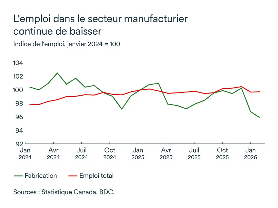 Le secteur manufacturier reste sous pression. L'emploi dans ce secteur a de nouveau reculé en février, portant le nombre total de pertes à environ 36 800 depuis le début de l'année, ce qui efface complètement les gains observés l'automne dernier.