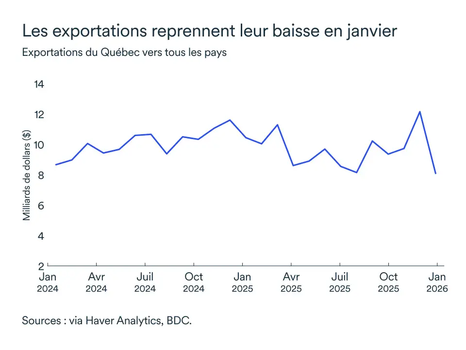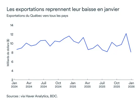 Les exportations ont reculé en janvier, après avoir augmenté régulièrement au dernier trimestre de 2025. Bien que cette donnée ne confirme pas une tendance, elle montre néanmoins que les tensions commerciales avec les États-Unis continuent de peser sur les échanges.