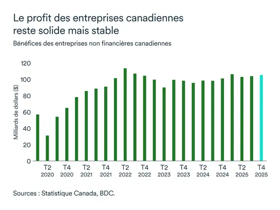 Cette nouvelle réalité se reflète déjà dans les marges bénéficiaires des entreprises. Une enquête de la BDC a révélé que deux entreprises sur trois au Canada étaient rentables, à l'aube de 2026. Mais, après avoir atteint un sommet en 2021, dans un contexte de forte demande et de capacité à ajuster rapidement les prix, les bénéfices des entreprises non financières ont commencé à baisser en 2023-2024 et se sont depuis stabilisés.