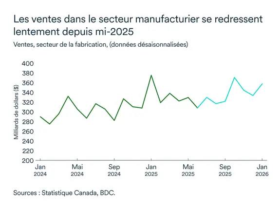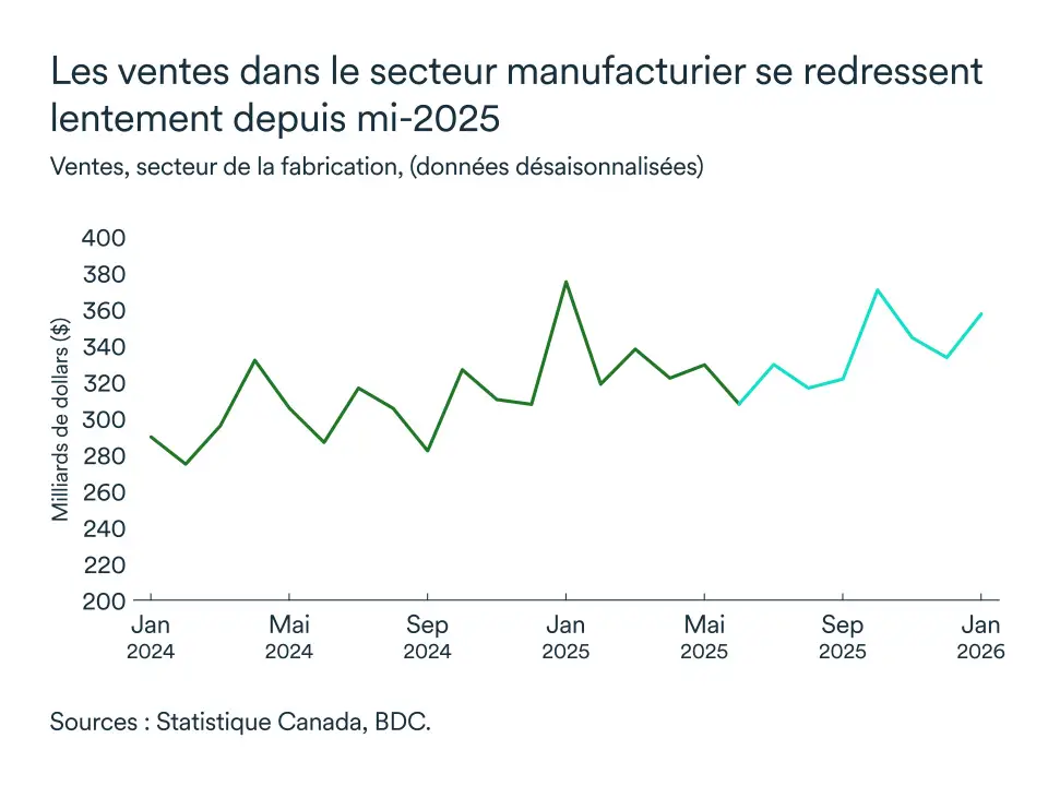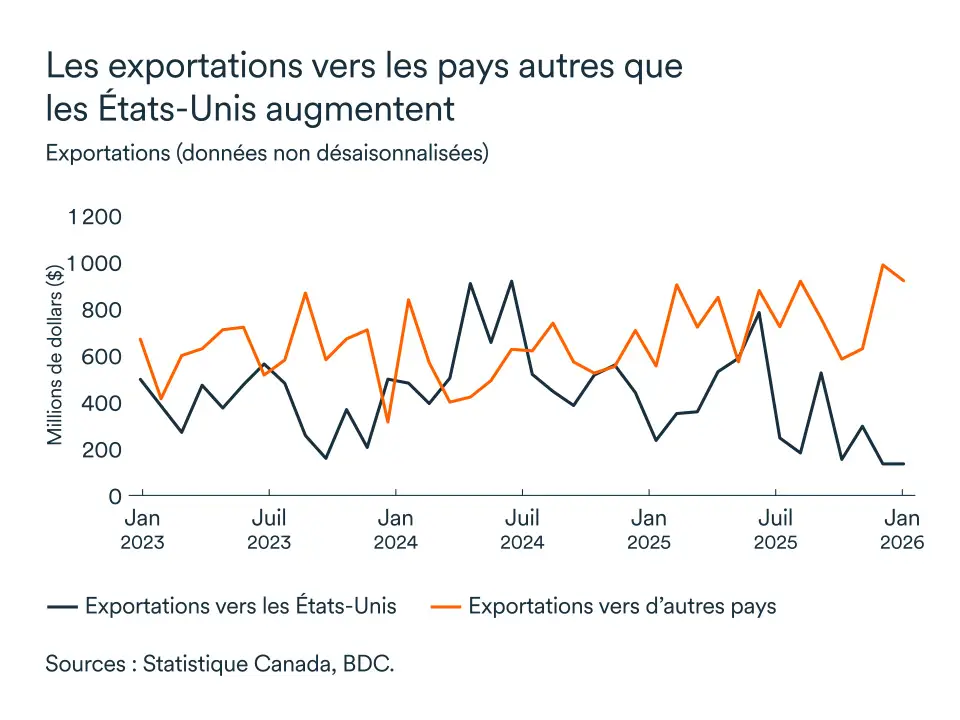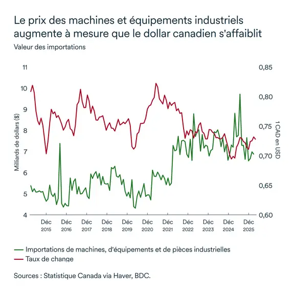 Le renforcement des barrières commerciales américaines a pesé sur les exportateurs canadiens, perturbant des chaînes d'approvisionnement profondément intégrées, en particulier dans les secteurs manufacturier et automobile. La reconfiguration des chaînes d'approvisionnement et le développement de marchés alternatifs exercent une pression à la hausse sur les coûts de production dans l'ensemble du secteur de production de biens au Canada.