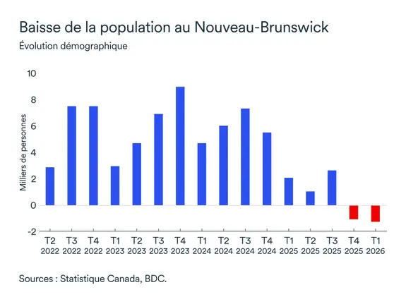 La population du Nouveau-Brunswick a diminué au cours des deux derniers trimestres à la suite des restrictions imposées à l'immigration temporaire au Canada. Une croissance démographique plus faible entraîne une augmentation plus lente de la consommation, une pression accrue sur la demande de logements et, bien sûr, une main-d'œuvre moins abondante. Dans l'ensemble, cela limitera donc la croissance de la province cette année.