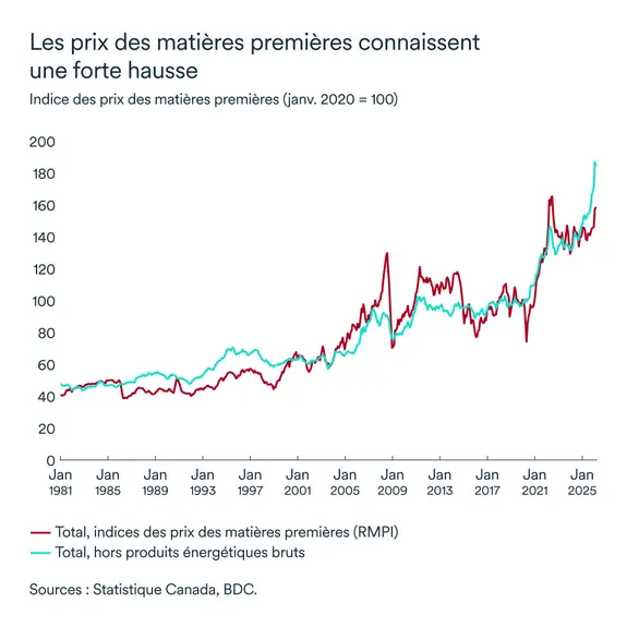 Les autres coûts des intrants, tels que les matières premières et les biens industriels, reflètent une situation similaire alors que les entreprises ressentaient encore une pression intense à l'approche du printemps 2026. En février, l'indice des prix des produits industriels (IPPI) du Canada a augmenté de 5,4 % en glissement annuel, et de 6,4 % (hors produits énergétiques). L'indice des matières premières hors énergie est encore plus préoccupant, avec une hausse de plus de 20 % depuis le début de l'année 2026 – un rythme similaire à celui observé en 2021 après la réouverture de l'économie suite à la pandémie de Covid.