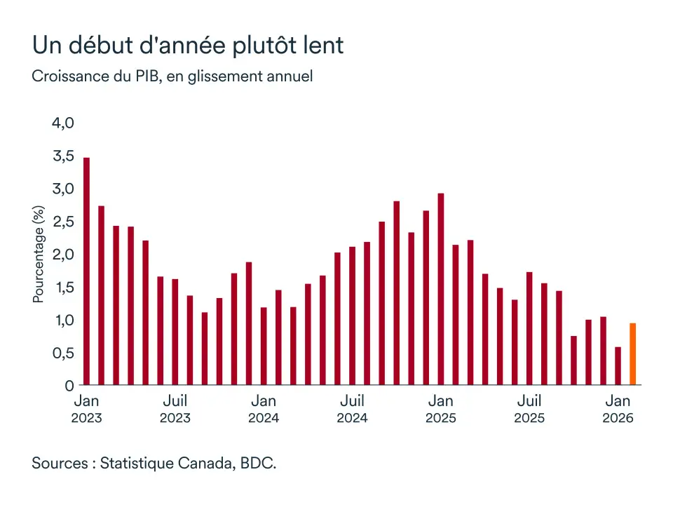 BDC s'attend toujours à ce que la croissance pour l'ensemble de l'année 2026 s'établisse autour de 1,0 %, soit nettement en deçà de son potentiel de 2,0 % — un chiffre qui indique que le Canada n'est pas en crise, mais qu'il ne prospère pas non plus.