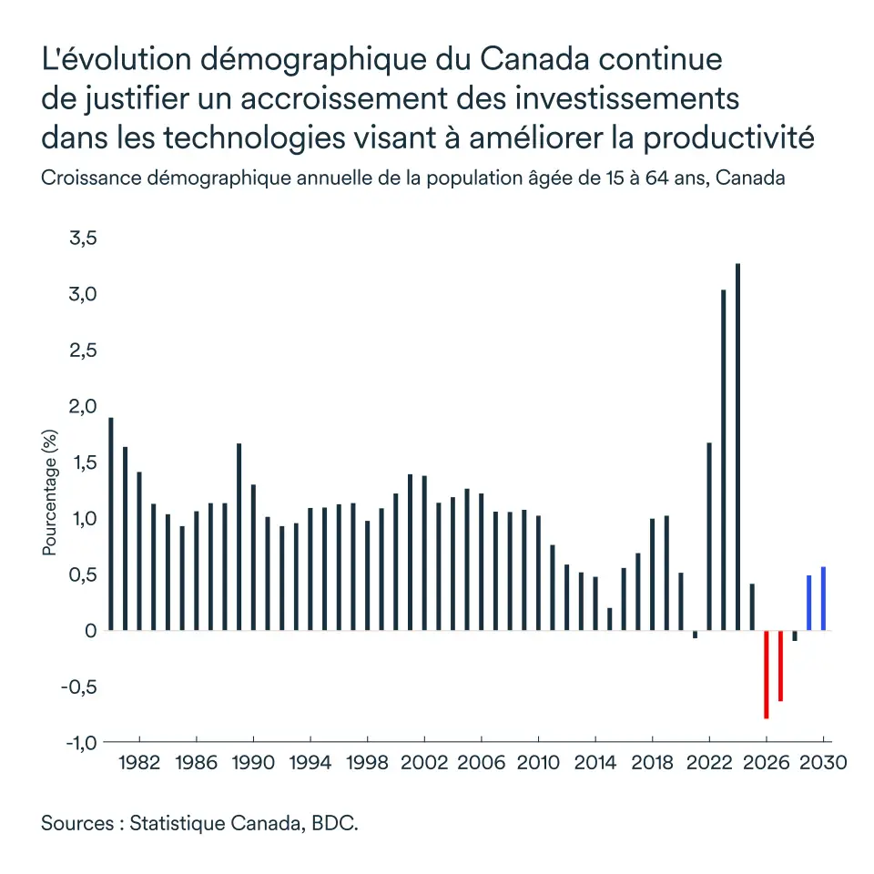 Ce ralentissement a déjà des répercussions sur le marché immobilier, en particulier dans la région du Grand Toronto et sur le secteur de l’enseignement supérieur, et il limitera la croissance de la consommation. Enfin, les entreprises devront investir davantage dans l’automatisation et la technologie pour faire face à un marché du travail plus tendu.