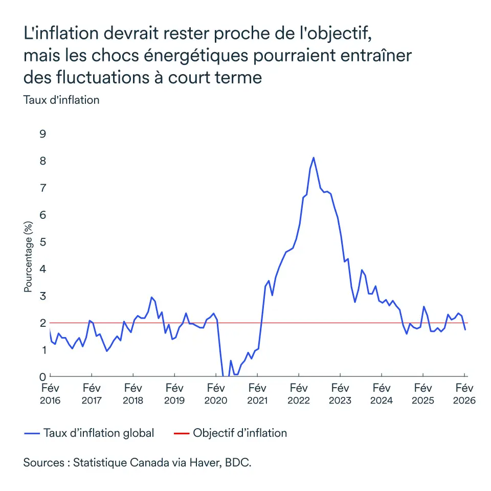Après le chaos de 2022 — année où l'inflation globale a dépassé les 8 % —, le Canada a largement remporté la bataille contre cette période de flambée des prix. En février 2026, l’inflation s’établit juste en dessous de l’objectif de la Banque, à 1,8 %. Le taux directeur de la banque centrale s’élève actuellement à 2,25 %, soit le niveau inférieur de sa fourchette neutre. Le taux directeur ne devrait pas évoluer à court terme, car l’économie est encore en surcapacité.