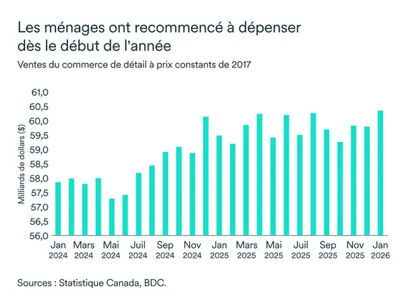 Les ventes au détail ont affiché une légère hausse en janvier (+0,2 % en glissement mensuel), mais le rythme de croissance s'est stabilisé par rapport à un second semestre 2025 particulièrement dynamique. Alors que les taux d'intérêt se sont modérés et que les ménages devraient ressentir un peu moins le poids de leur endettement relativement élevé, les fondamentaux de la consommation ont été affectés par la faiblesse du marché du travail et l'incertitude persistante entourant le commerce.