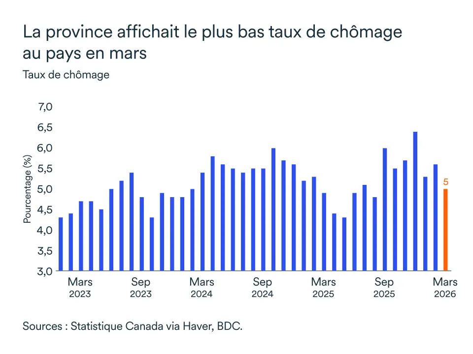 Le marché de l’emploi montre des signes d'assouplissement après une baisse significative en février ; les créations d'emplois ont été modestes, avec environ 10 000 emplois supplémentaires en mars. Le taux de chômage est resté parmi les plus bas du Canada en raison de facteurs démographiques.
