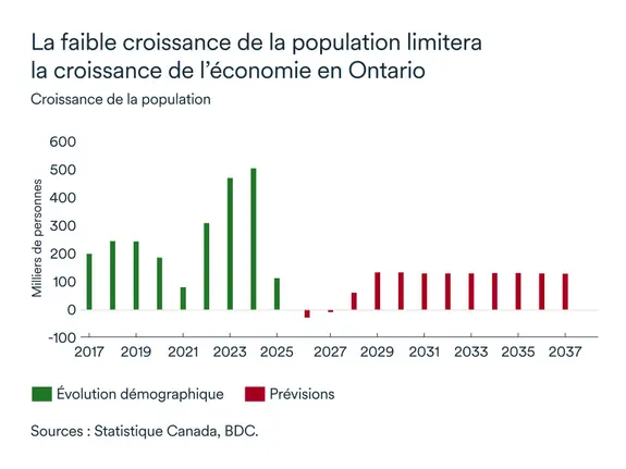 Nous prévoyons toujours une croissance modeste de 0,8 % pour la province en 2026, freinée par une baisse de la demande extérieure pour les produits soumis à des droits de douane, une incertitude persistante et une croissance démographique plus faible.